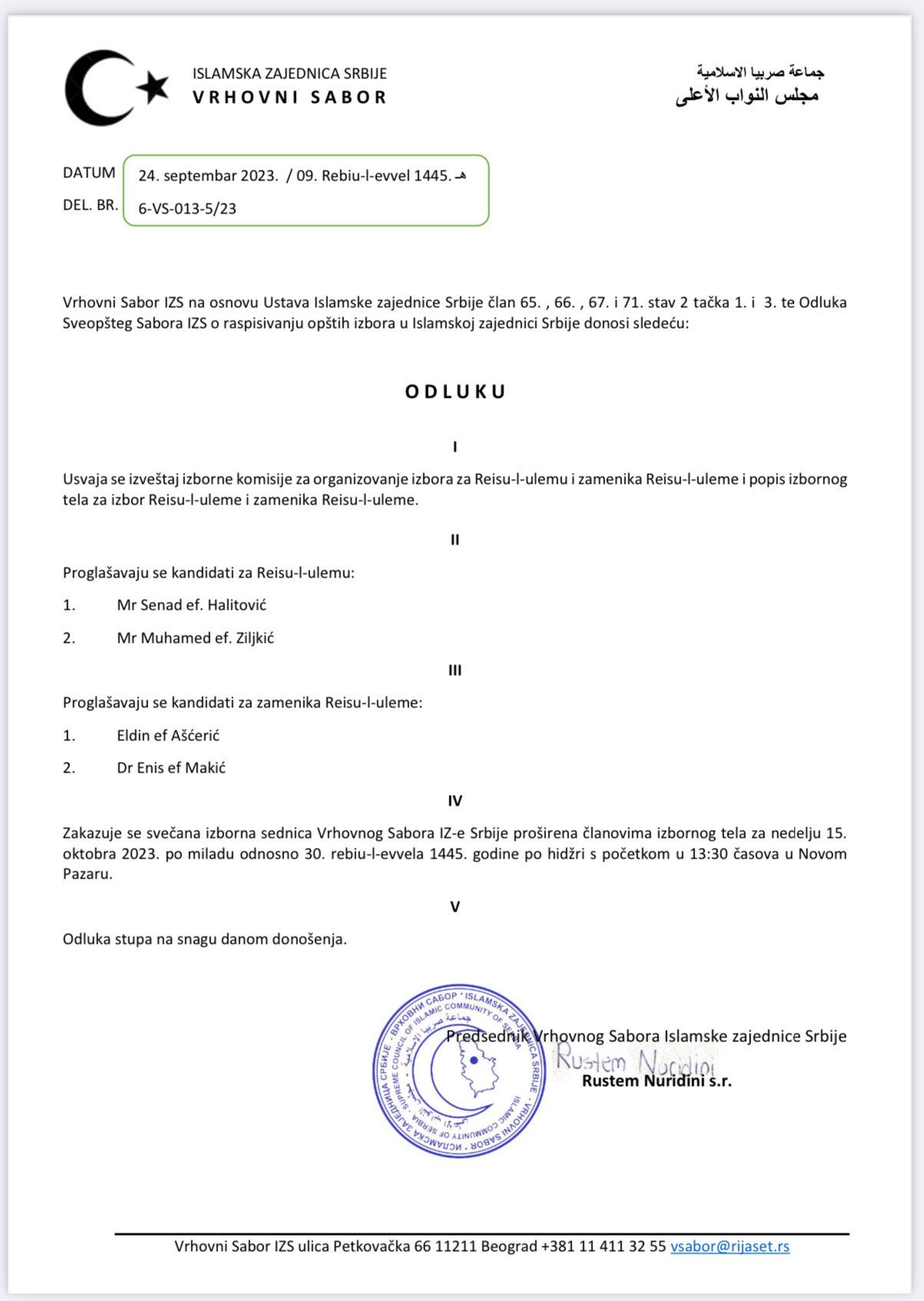 Naime na sednici Vrhonog sabora održanoj u Beogradu dana 03. septembra 2023. godine doneta je odluka o formiranju izborne komisije koja je imala zadatak da definiše izborno telo u skladu sa pravilnikom o izboru Reisu-l-uleme i zamenika Reisu-l-uleme te da shodno Ustavu Islamske zajednice Srbije zaprimi kandidature za Reisu-l-ulemu i zamenika Reisu-l-uleme i da ocenu o ispunjenosti uslova propisanih Ustavom te Pravilikom o izborima za Reisu-l-ulemu i zamenika Reisu-l-uleme.