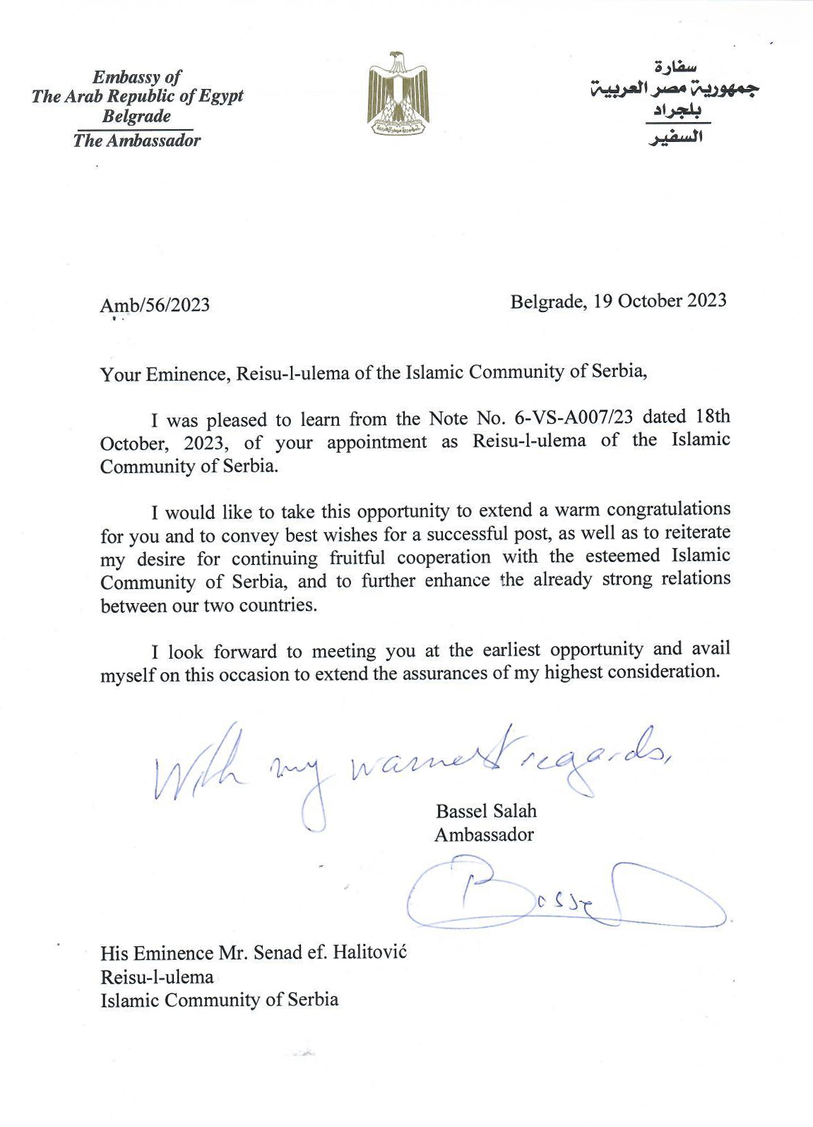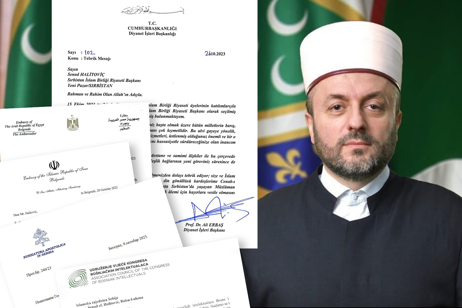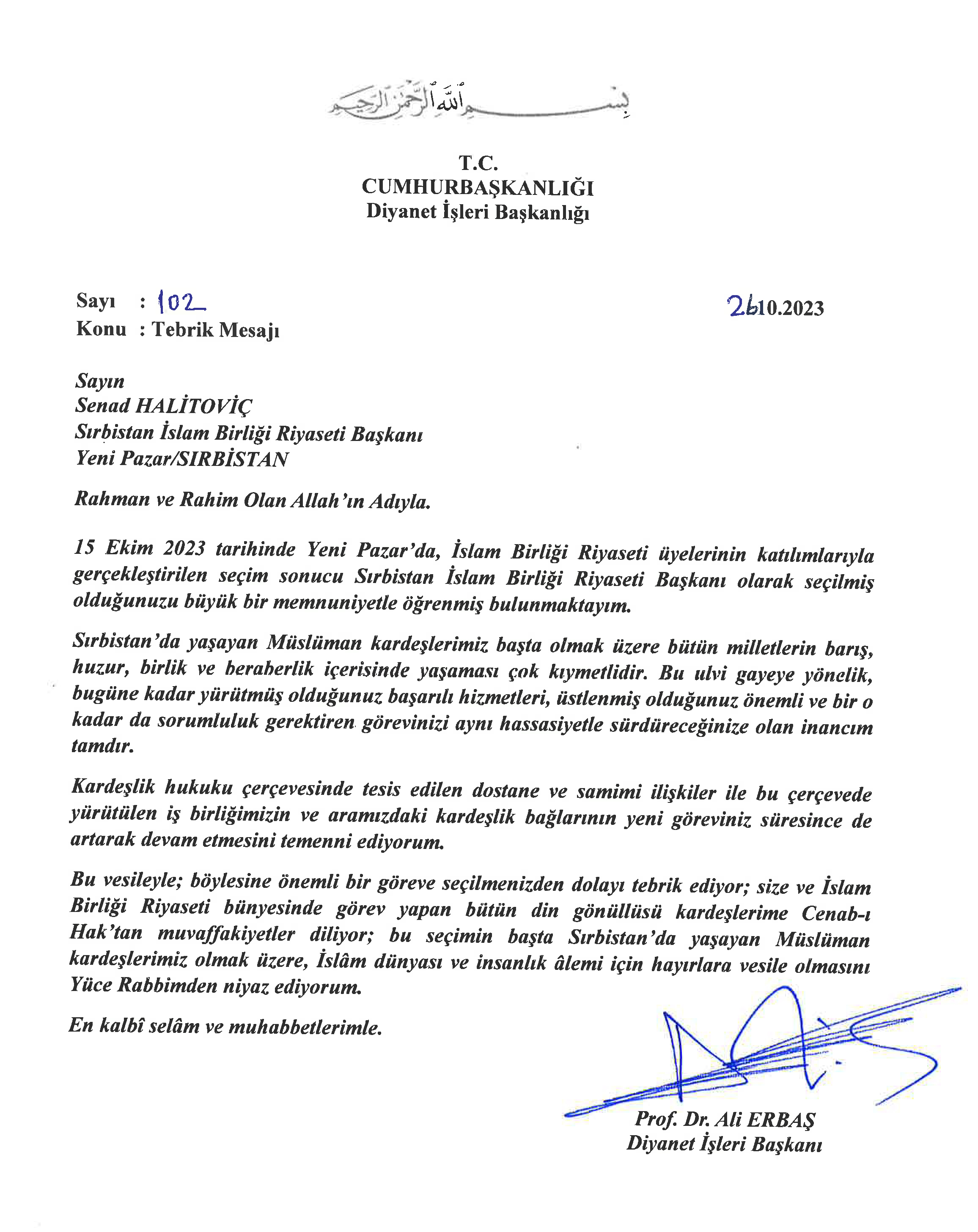 Tim povodom Vam čestitam na izboru na tako važnu funkciju, molim Svevišnjeg Gospodara da Vama i svim vjerskim službenicima koji rade u Rijasetu Islamske zajednice Srbije podari uspjeh i da ovaj izbor bude od koristi, prije svega za našu braću muslimane koji žive u Srbiji, a zatim i za cijeli islamski svijet i čovječanstvo.