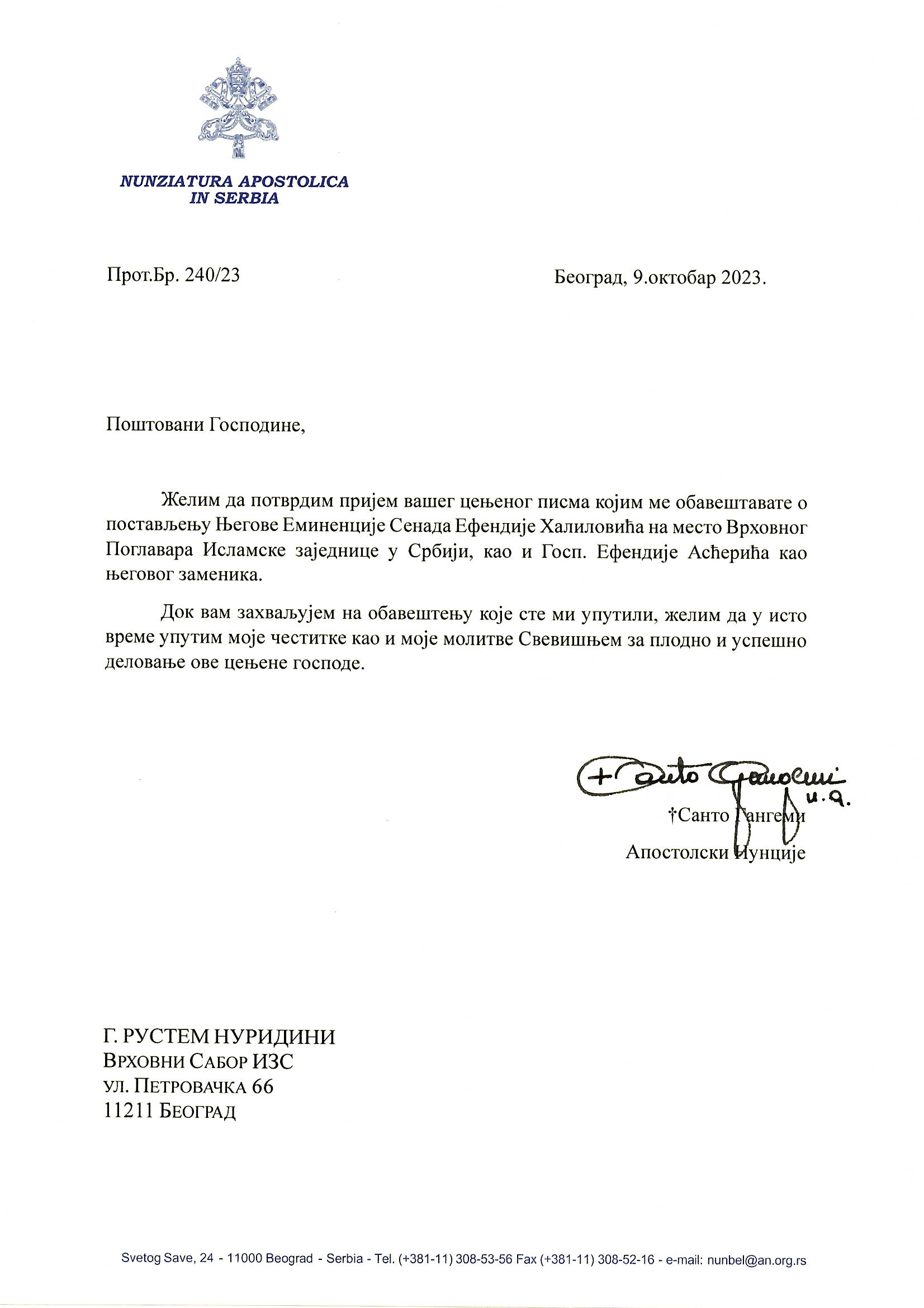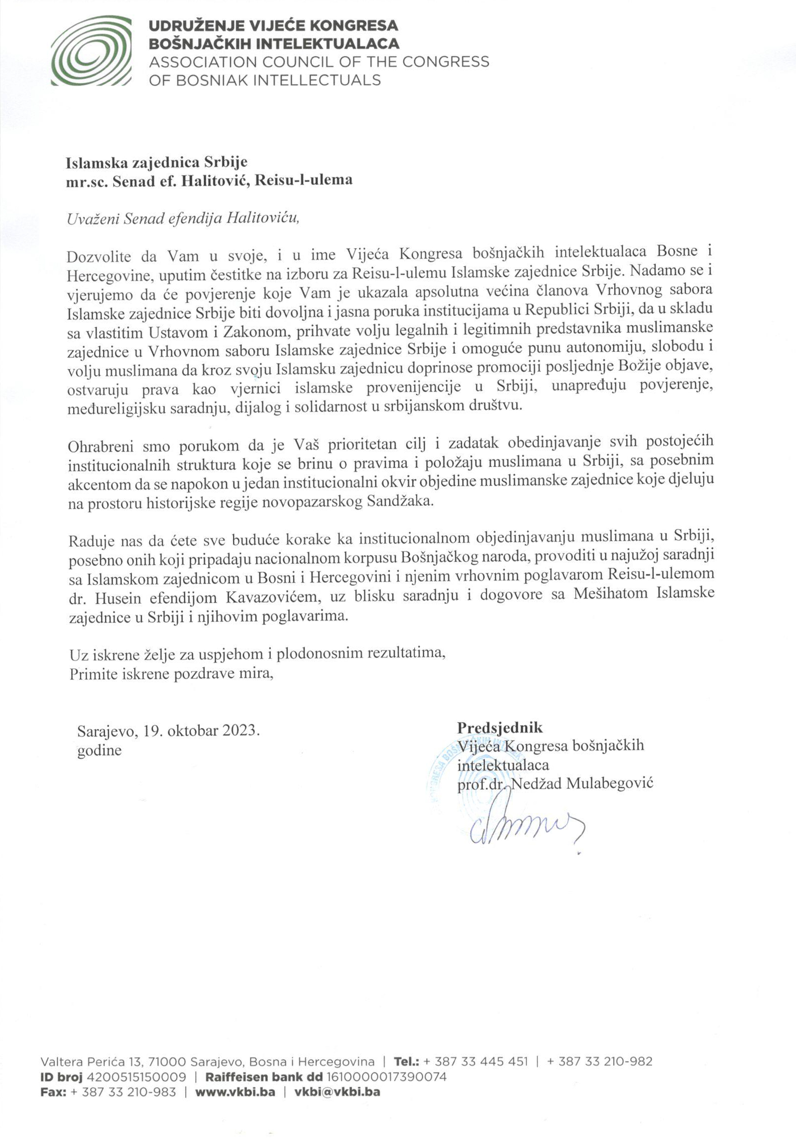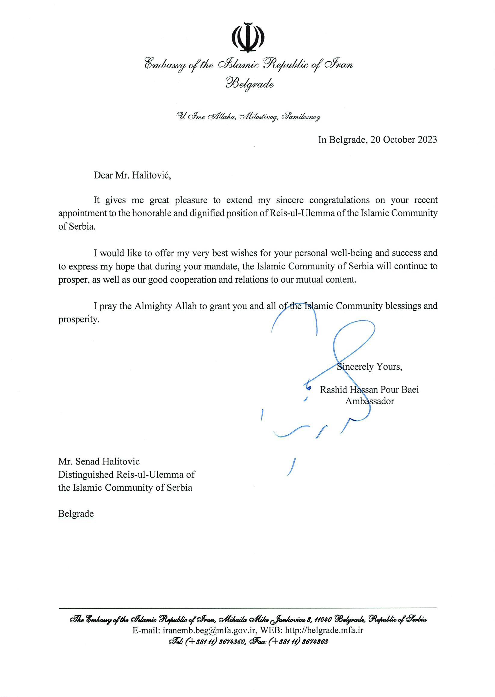 Tim povodom Vam čestitam na izboru na tako važnu funkciju, molim Svevišnjeg Gospodara da Vama i svim vjerskim službenicima koji rade u Rijasetu Islamske zajednice Srbije podari uspjeh i da ovaj izbor bude od koristi, prije svega za našu braću muslimane koji žive u Srbiji, a zatim i za cijeli islamski svijet i čovječanstvo.